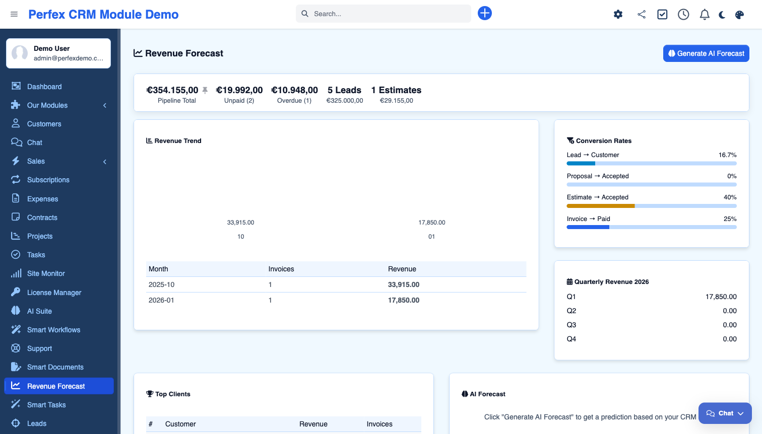 Transform your CRM data into actionable revenue predictions. The Revenue Forecast add-on analyzes your pipeline, invoices, conversion rates, and client history to generate AI-powered forecasts with confidence scores. Features a dedicated dashboard with KPI cards, monthly revenue trends, quarterly breakdowns, conversion rate analysis, and top client reports.